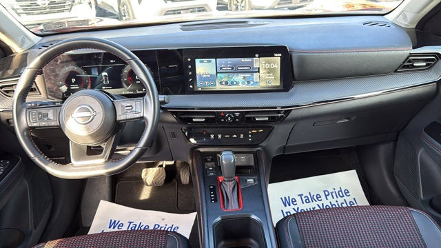 Check out all these great options 17" Alloy Wheels, 19" Alloy Wheels, 2-Tone Premium Paint, 4-Wheel Disc Brakes, 6 Speakers, ABS brakes, Air Conditioning, Alloy wheels, AM/FM radio: Sirius, Auto High-beam Headlights, Automatic temperature control, Brake assist, Bumpers: body-color, Carpeted Floor Mats, Delay-off headlights, Driver door bin, Driver vanity mirror, Dual front impact airbags, Dual front side impact airbags, Electronic Stability Control, Four wheel independent suspension, Front anti-roll bar, Front Bucket Seats, Front Center Armrest, Front reading lights, Fully automatic headlights, Heated door mirrors, Illuminated entry, Knee airbag, Leather Shift Knob, Leather steering wheel, Low tire pressure warning, Occupant sensing airbag, Outside temperature display, Overhead airbag, Overhead console, Panic alarm, Passenger door bin, Passenger vanity mirror, Power door mirrors, Power steering, Power windows, Radio data system, Radio: AM/FM Audio System, Rear anti-roll bar, Rear reading lights, Rear seat center armrest, Rear side impact airbag, Rear window defroster, Rear window wiper, Remote keyless entry, Security system, Speed control, Speed-sensing steering, Splash Guards, Split folding rear seat, Spoiler, Sport Cloth/Leatherette Seat Trim, Sport steering wheel, Steering wheel mounted audio controls, Tachometer, Telescoping steering wheel, Tilt steering wheel, Traction control, Trip computer, Turn signal indicator mirrors, Variably intermittent wipers, and Wireless Apple CarPlay/Wireless Android Auto. CARFAX One-Owner. Scarlet Ember Tintcoat/Super Black 2025 Nissan Kicks SR AWD CVT with Xtronic 2.0L DOHC
